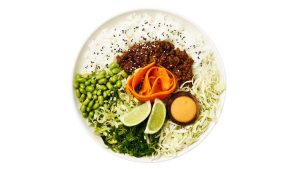 Varme ris, varm pulled chicken eller matr med teriyaki, kål, edamame, syltet gulerod, porre, tangsalat, lime & sesam / kimchidressing