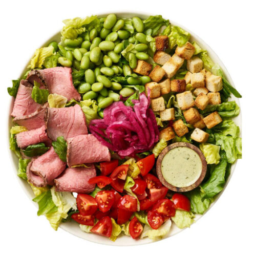Romaine, okse, tomater, syltede rødløg, edamame bønner & croutoner/ Estragondressing