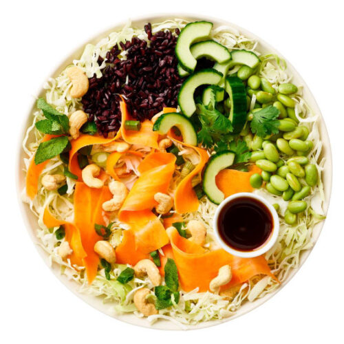 Kål & sorte ris, edamame bønner, agurk,chili-ingefærsyltede gulerødder, porre, mynte, koriander & cashewnødder/ Thaidressing