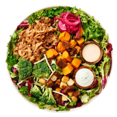 Salatmix, pulled pork, syltede rødløg,søde kartofler, broccoli & croutoner/ Chipotledressing & urtedressing
