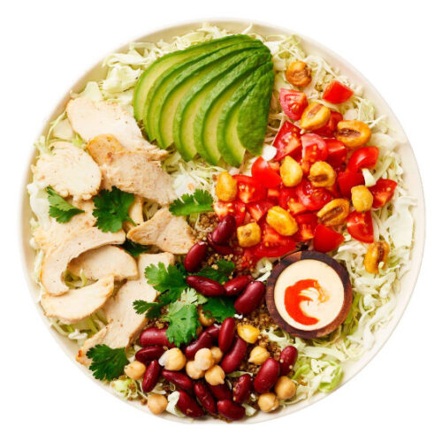 Kål & quinoa, tomat, avokado, kylling, bønnemix, koriander & sprøde majs / Harissa & chipotledressing