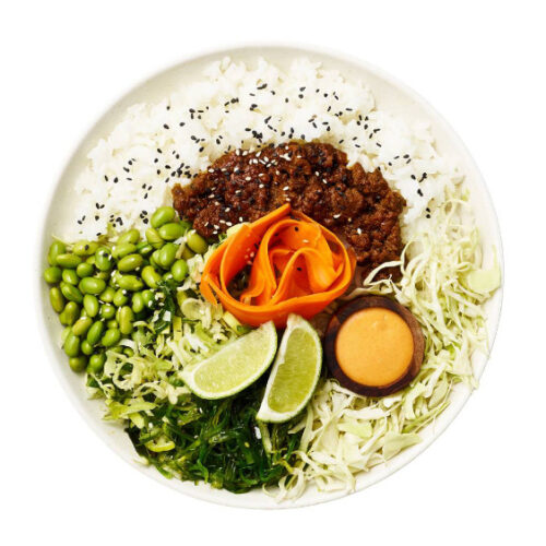 Varme ris, matr med teriyaki, kål, edamame Syltet gulerod, porrer, tangsalatLime & sesamfrø / Kinchidressing