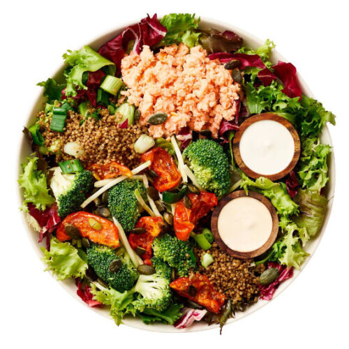 Quinoa & salatmix, varmrøget laks,broccoli, porre, semitørredetomater & ristede græskarkerner/ Chipotledressing & fransk dressing
