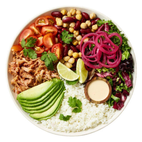 Lune ris, varm pulled pork, salatmix, syltede rødløg, cherrytomater, bønnemix, avokado, frisk koriander & frisk lime/ Chipotledressing