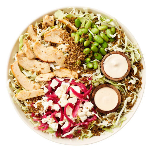 Kål & quinoa, kylling, syltede rødløg, salatost & edamame bønner/ Cæsardressing & chipotledressing