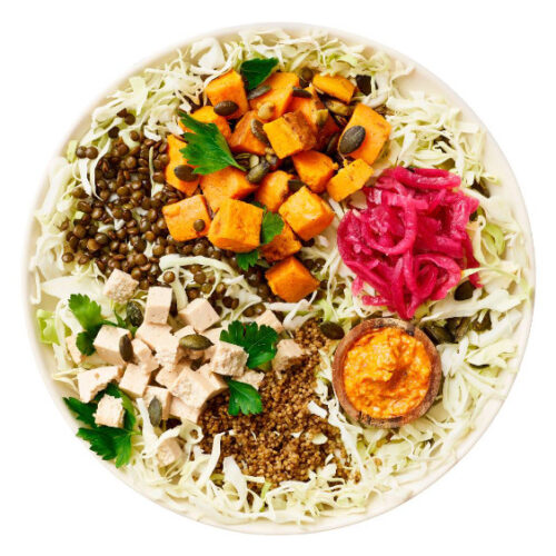 Kål & quinoa, puy linser, søde kartofler, syltede rødløg, tofu, ristede græskarkerner & frisk persille/ Salsa romesco
